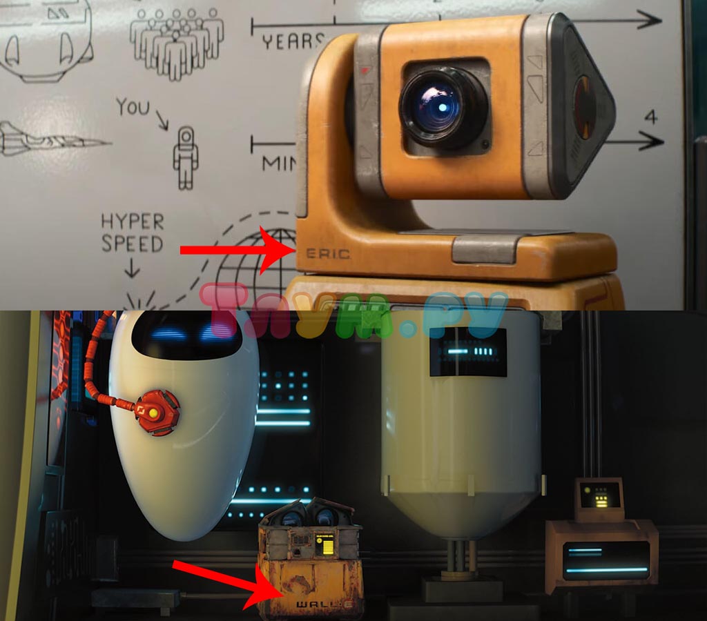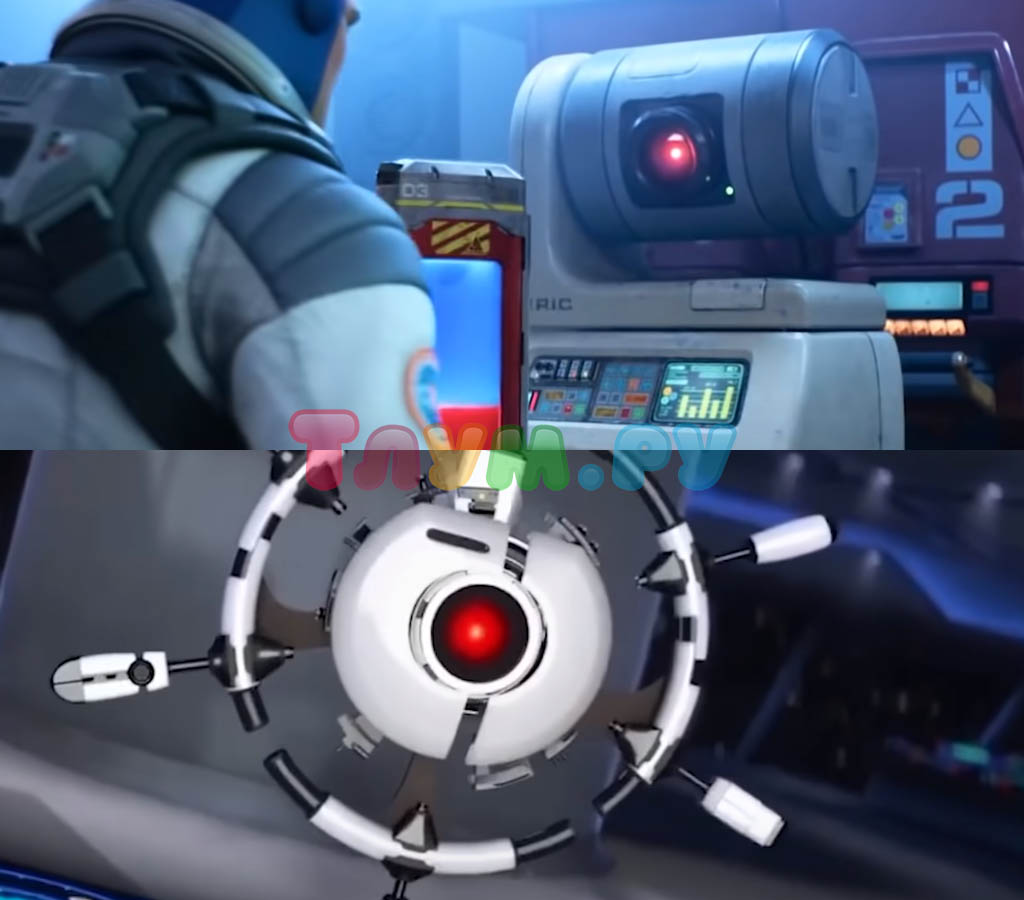 Робот-помощник, объясняющий Баззу его миссию, отсылает к образу ВАЛЛ-И и других роботов, показанных в милом мультфильме о спасении человеческой расы.