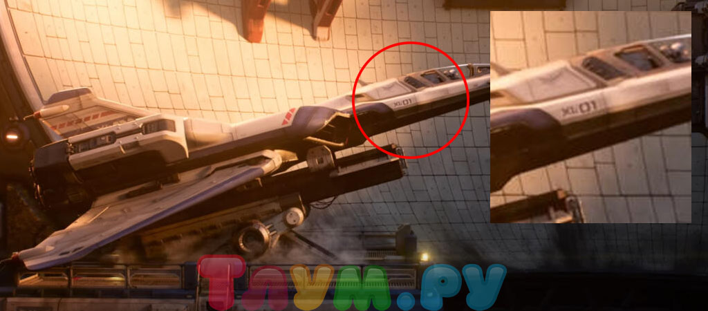 Базз становится первопроходцем сложнейшей миссии, о чём говорят не только через рот: на его космическом судне есть соответствующая надпись.