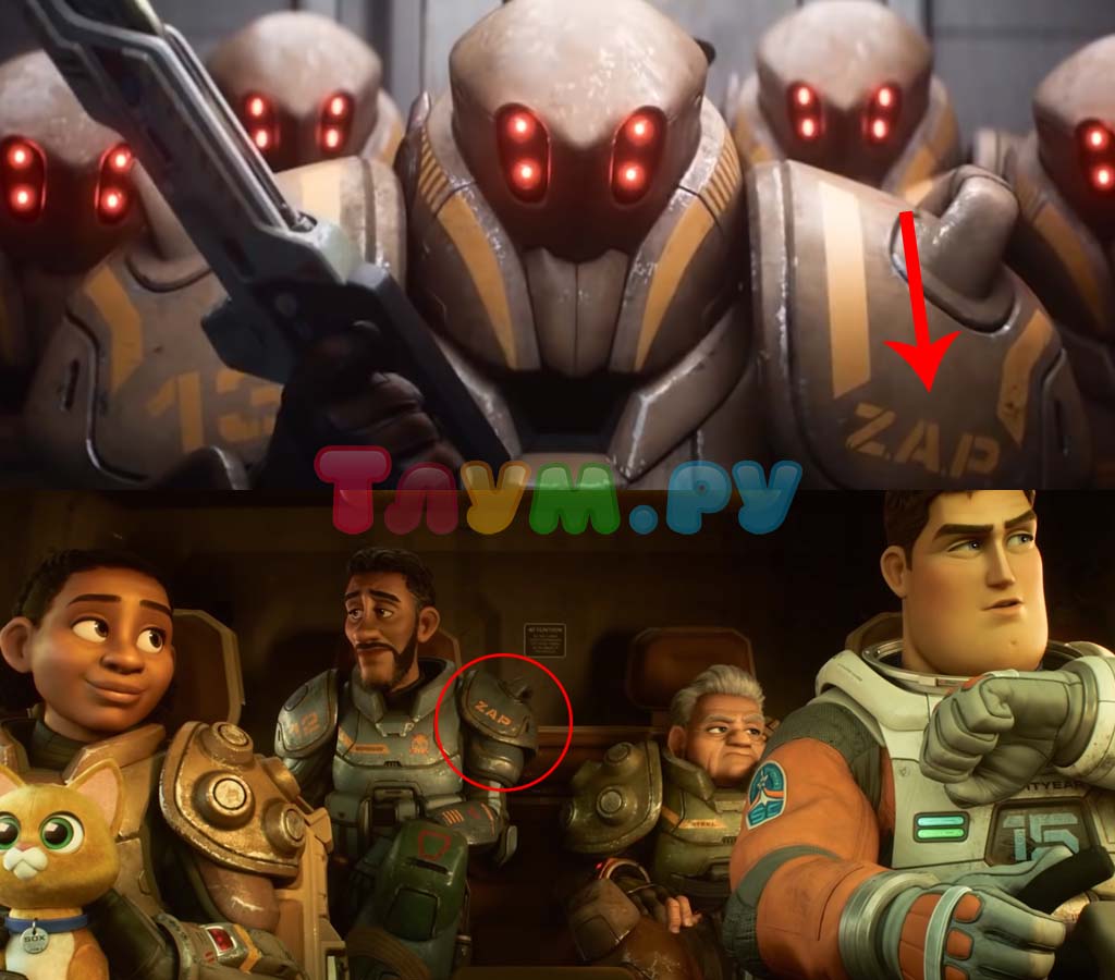 Экипировку в космосе отменить нельзя, однако создаётся впечатление, что Базз встретится то ли со злыми клонами, то ли с похищенными коллегами. В трейлере чётко видно, что на героя собирается нападать отряд, надпись «Z.A.P» выдаёт своих. Подозрительно. Помните, что и во вселенной «Звёздных войн» были клоны?