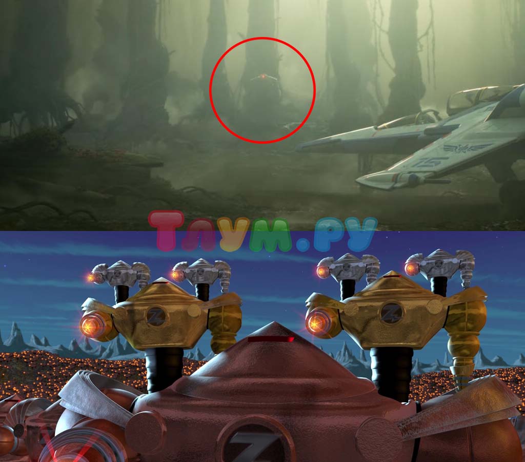 Все фанаты игрушечной истории в курсе, что тот самый злодей Зург является отцом Базза, а вторая часть франшизы — детская адаптация истории, случившейся с Люком и сами знаете кем. Так вот, в лесу можно заметить подозрительные очертания, напоминающие часть армии Зурга.