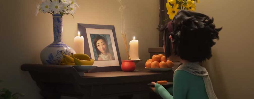 Связан прямой такой линией. Мы увидим китайскую семью и девочку по имени Фей Фей, увидим мы не только её, но и родителей героини. И услышим легенду о том, как Лунная Богиня и её возлюбленный расстались по несчастливой случайности. Повествует историю мать Фей Фей, и именно ей по сюжету суждено умереть.
