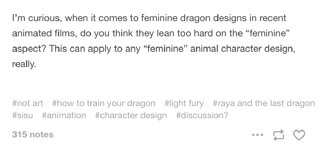 «Мне интересно, когда доходит до дизайна драконов женского пола в последних мультфильмах, они слишком сильно полагаются на „женственность“? Это можно применить к любому „женственному“ дизайну животных из мультфильмов»