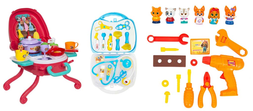 Игровые наборы. В продаже есть наборы для доктора, строителя или любителей высокой кухни. Просто устроить чаепитие со вкусняшками тоже можно.