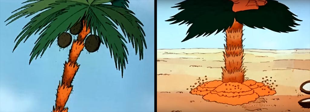 Вот классический пример с исчезновением, причем двойным: сначала на пальме висит три кокоса, но в процессе жестокого втаптывания пальмы в песок их уже нет. Про цвет листвы даже спрашивать не будем.