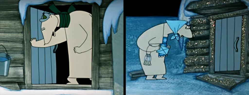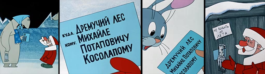 Поговорим о письмах. Во время доставки медвежьего конверта особым образом ведут себя надписи — это тоже дело известное для мультика, но понаблюдать все равно любопытно. Одна сторона конверта щеголяет строчками с адресом, количество которых варьируется. Другая сторона — классический «ромбик» со сгибами конверта, но на последних кадрах со своим участием конверт абсолютно чист — ни букв, не сгибов. Хорошо хоть цвет тот же!
