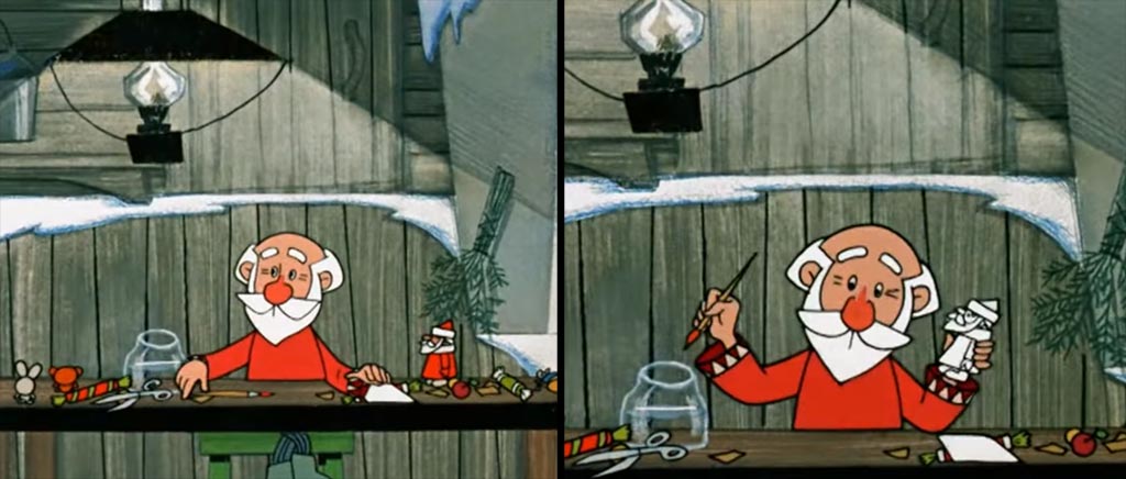 Здесь же можно наблюдать чудеса передвижений на столе. Дом, стоящий аккурат на Северном полюсе, просто не может быть обставлен простой бездушной мебелью — так что неудивительно, что на столе царит хаос необъяснимых перемещений. Повторно раскрашенный Дед Мороз был поставлен к банке, справа (слева для нас) от главного героя. Рядом с банкой никаких зайцев не наблюдается. Они неожиданно появляются в следующих кадрах.