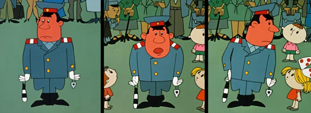 И закончим тему цветной переменчивости одеждой бравого милиционера. Его форма меняет оттенки опять-таки прямо на глазах зрителей. Сначала один цвет, затем посветлел пиджак, следом — брюки. И пусть подобная смена оттенков — вполне обычное дело для мультфильмов, настолько очевидная и разительная встречается не так часто.
