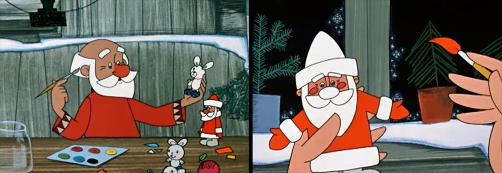 Хотите еще магической краски? Не вопрос — на игрушечной фигурке она исчезает аж два раза. Вот первые кадры сцены: справа от старательного раскрасчика находится вполне себе цветной красно-белый Дед Мороз. Стоит самому Деду Морозу взять в руки свою маленькую копию — она моментально обесцвечивается, причем у зрителей на глазах, этот момент можно увидеть невооруженным взглядом!